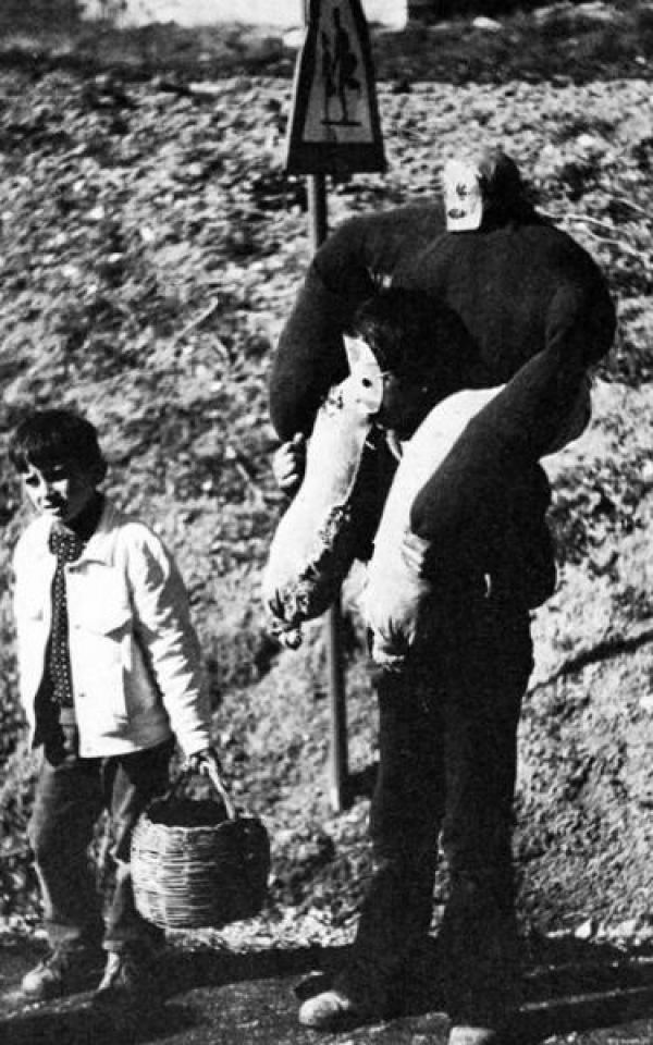 Dintorni di Nusco, questua delle uova fatta da bambini che portano sulle spalle il Carnevale morente.