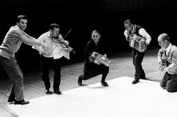 Due momenti dello spettacolo Sentite buona gente di Roberto Leydi con i musici del Salento: nella seconda, sullo sfondo, scene tratte da La taranta di Gianfranco Mingozzi.